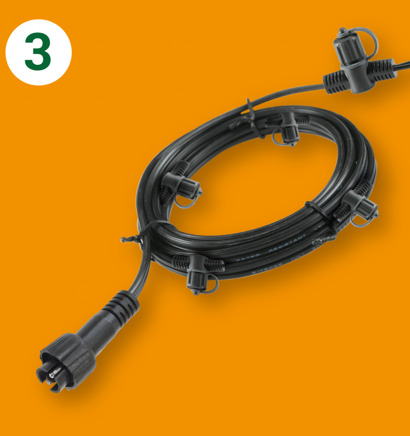 We offer 2 types of cable; standard cables with fixed connectors and deluxe flex cable with loose connectors. The standard cables come in set lengths of 8, 10 & 15mtrs and have pre-moulded sockets in set positions. This is a typical plug & play system, the lights come with a cable and a male plug which will connect straight into the pre-moulded socket.
